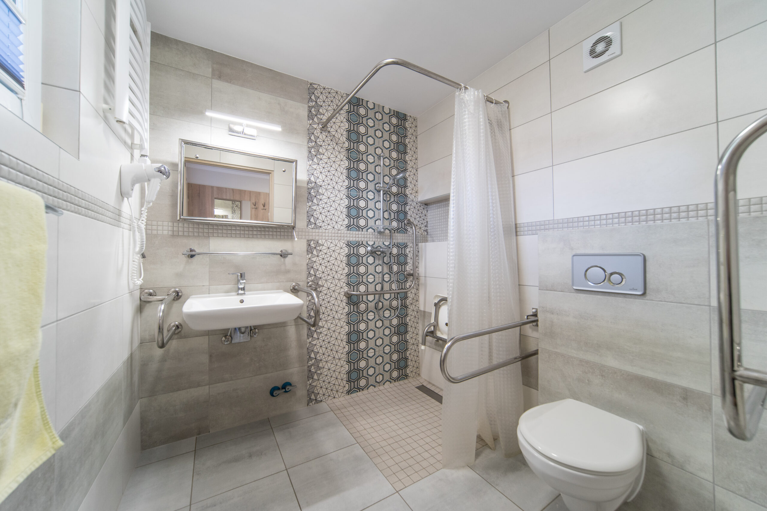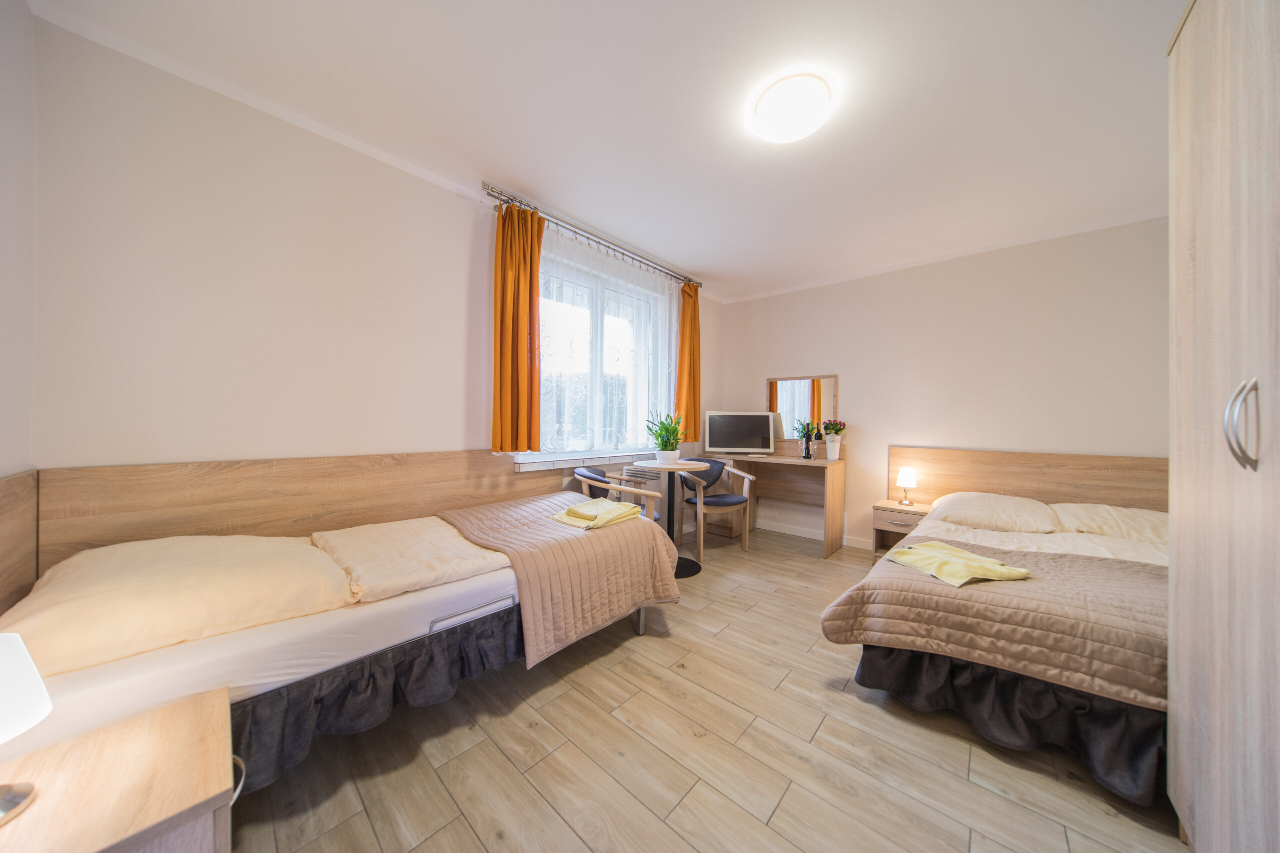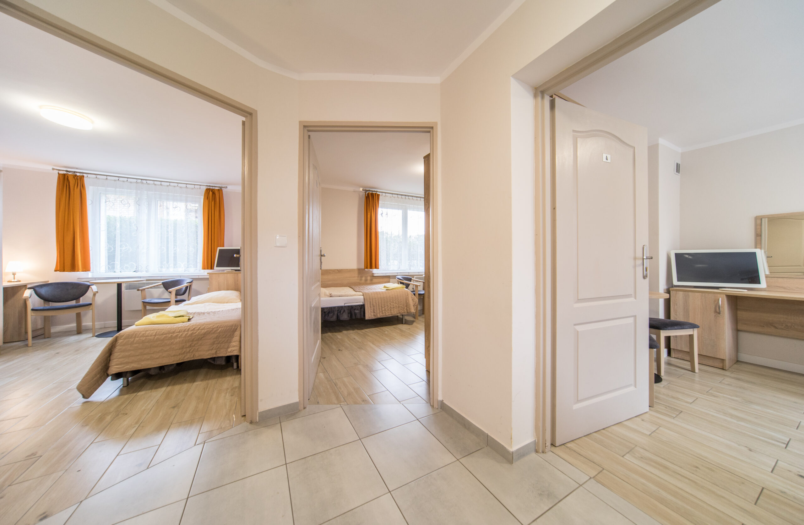 Pokoje w Pawilonie A funkcjonują w zestawach. Jedna łazienka i WC przypadają na 2 lub 3 pokoje.