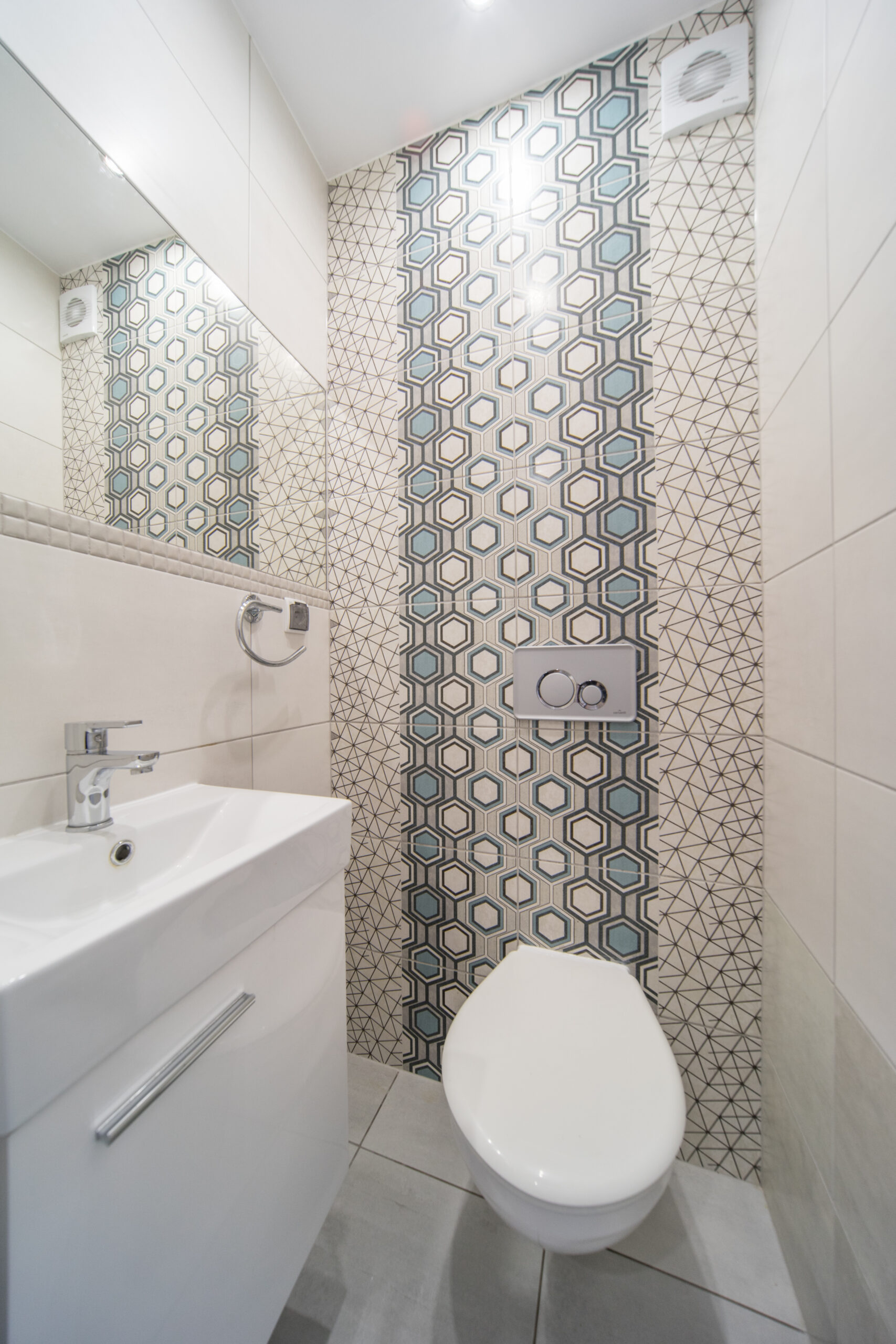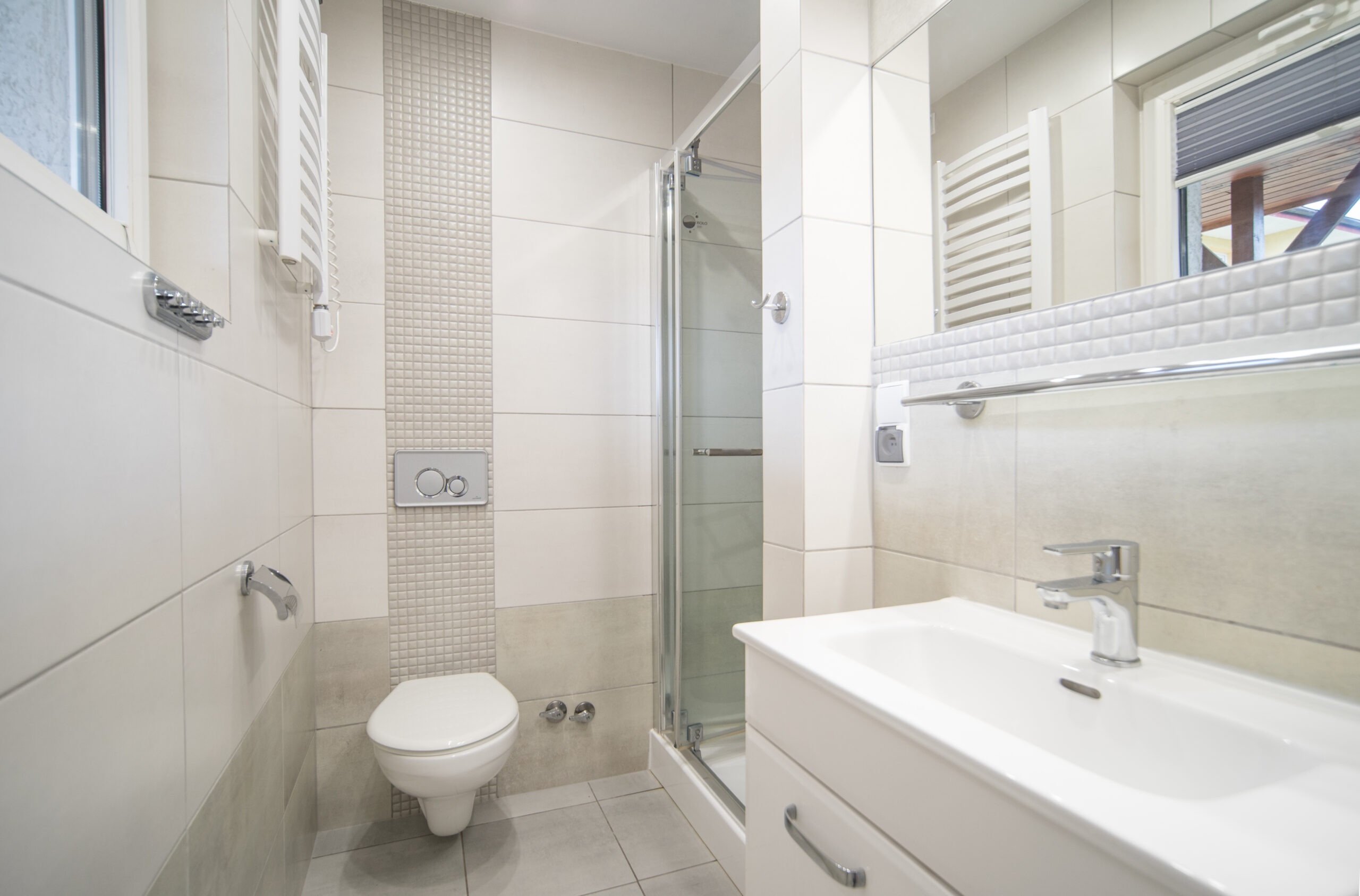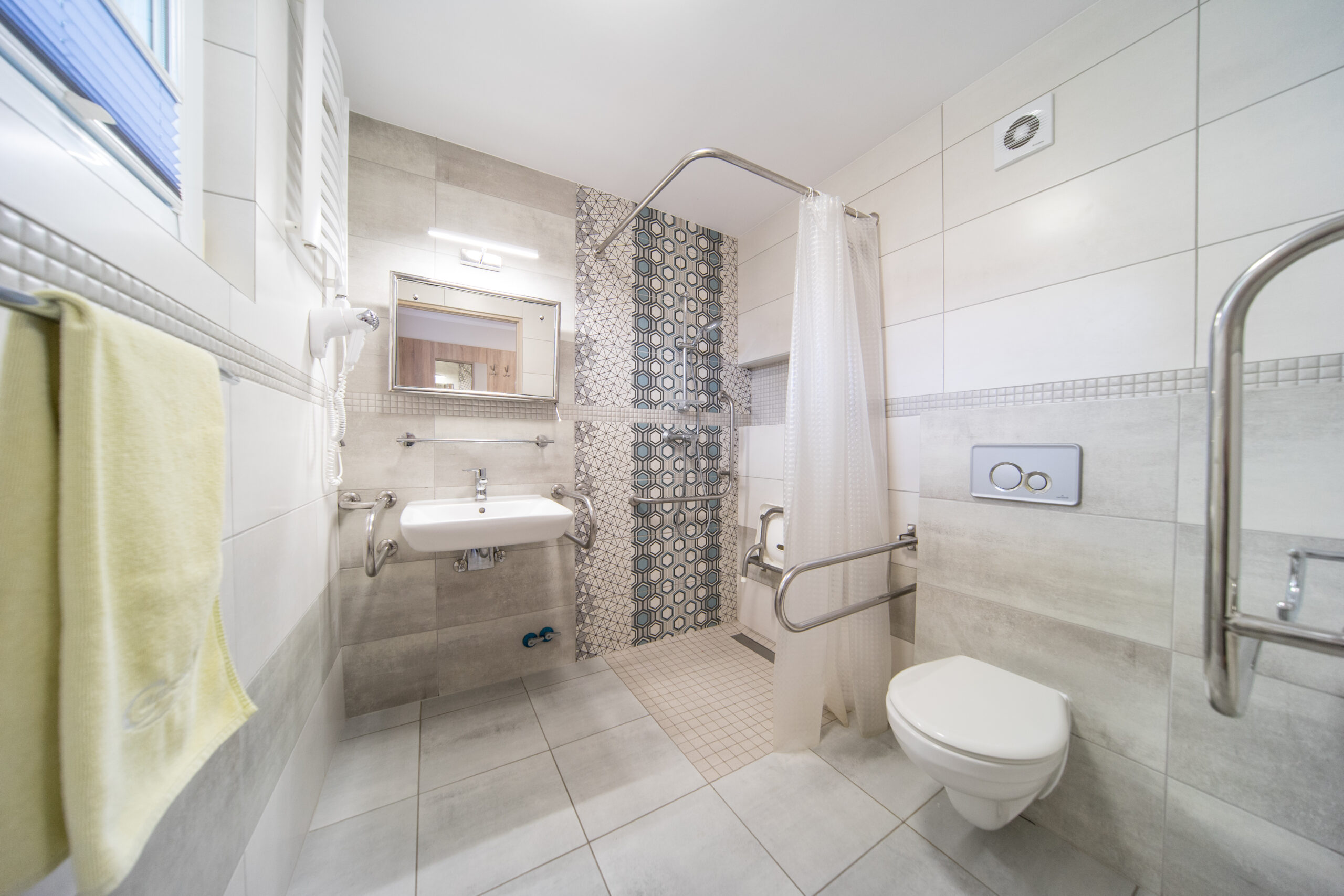 Pokoje w Pawilonie A funkcjonują w zestawach. Jedna łazienka i WC przypadają na 2 lub 3 pokoje.