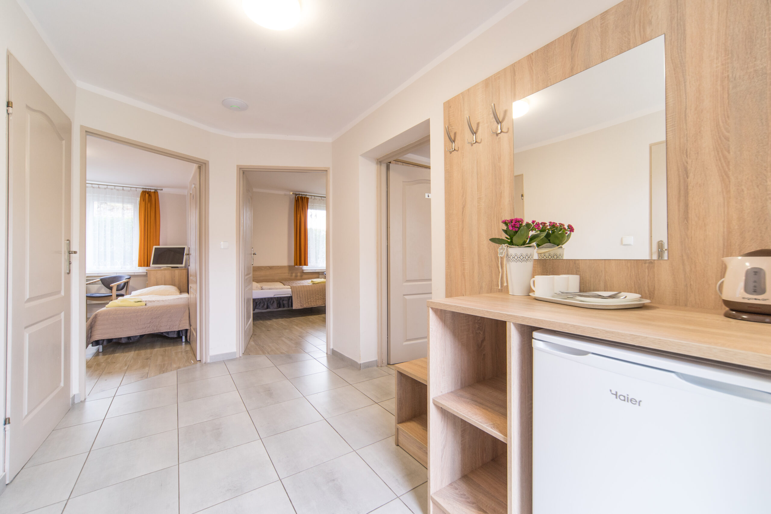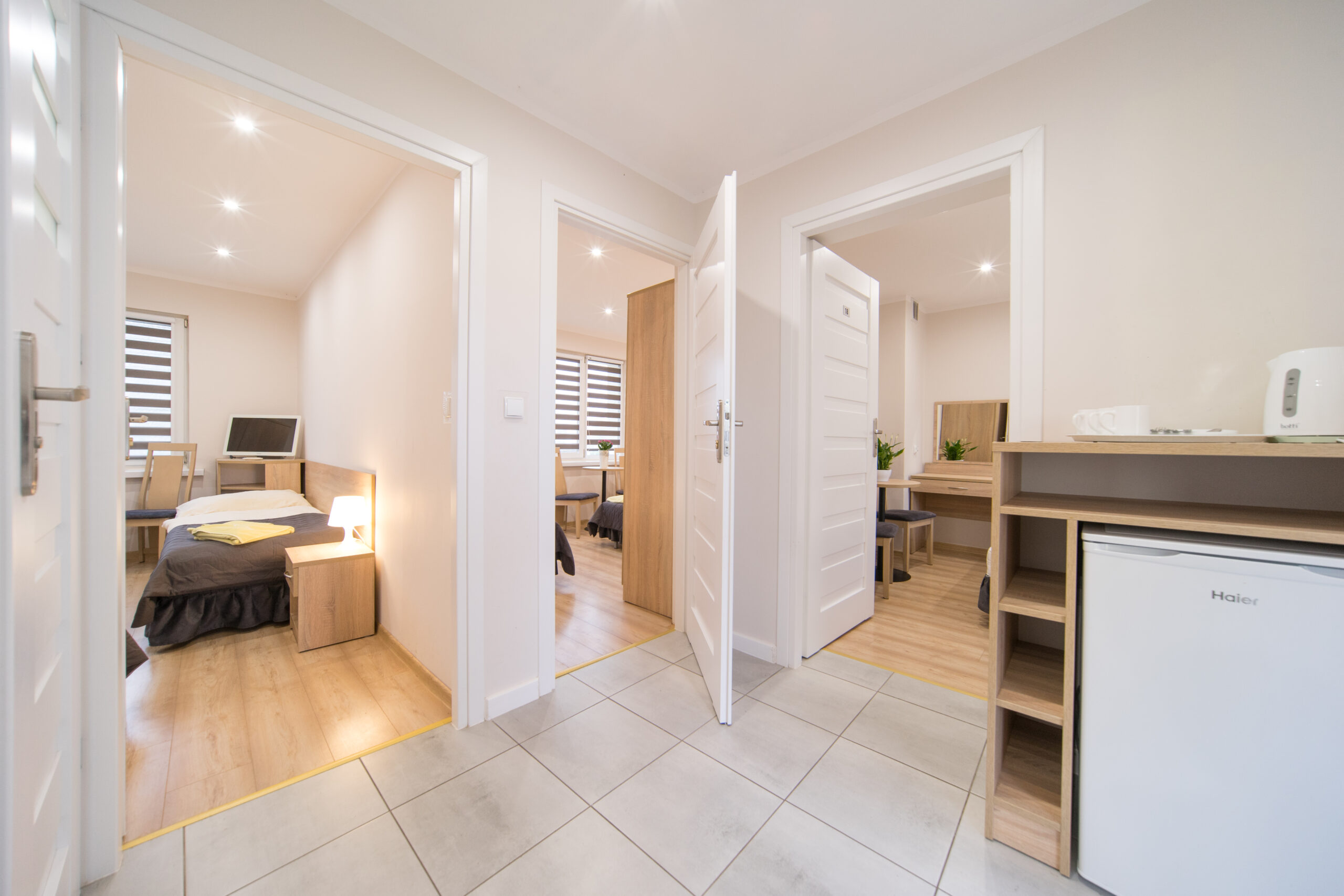 W holu każdego studia znajduje się szafka kuchenna wyposażona w lodówkę i czajnik. Jest ona wspólna dla mieszkańców danego studia (2-3 pokoje).